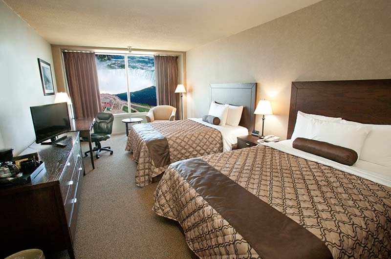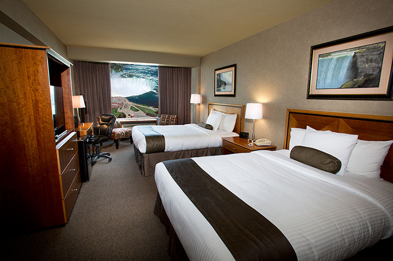 Premier Collection - 2 Queen Premier Fallsview Room A luxurious, freshly updated room located on floors 8 through 20, with floor to ceiling windows offering the most magnificent view of Niagara Falls available. This spacious room includes two queen size beds, 4-piece bathroom with granite counter tops, desk and chair, LED TV with HD programming, and hair dryer. All of our Premier Collection rooms feature fresh new carpeting, plush white duvet and bedding, alarm clock, an in-room fridge, two bath robes and upgraded bathroom amenities. Room service is also available from our on-site Applebees.