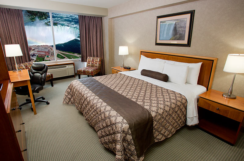 This newly renovated room overlooks beautiful Niagara Falls. Located on floors 8 through 12, it has floor to ceiling windows of the most magnificent view of the Falls available! These spacious rooms come equipped with two queen size beds, desk and chair, LED TV with HD programming, radio alarm clock, hair dryer and designer amenities. All rooms at The Oakes Hotel are Non-Smoking. Room service is also available from our on-site Applebees.